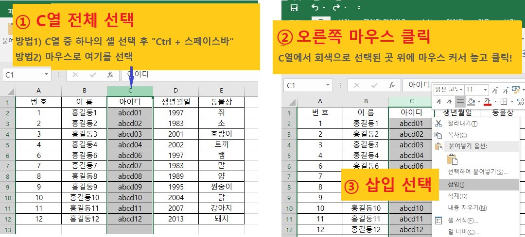 엑셀에서 행 · 열 삽입은 자주 사용 하는 기능 입니다.