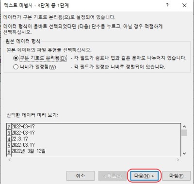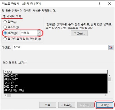 2. 데이터 → 텍스트 나누기 → 다음 → 다음 → "열 데이터 서식" 항목 "날짜" 선택 → 마침